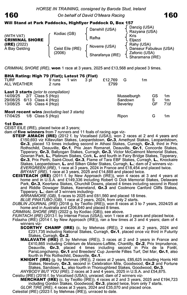 Prior to purchase, he had achieved one win, three seconds and a third from 13 starts in his career, with a further four fourth places. The form of his win on handicap debut last April was franked by the second (the pair were 3.5 lengths clear of the third) as Last Shamardal went on to win at Sandown in June and is now rated 80. On his final start when second at Newcastle, Criminal Shore travelled really well into the race, but was ridden too aggressively, with the jockey going for home too soon - a view David shares with us. Criminal Shore is ultra consistent, very sound and we feel he is well-handicapped, with plenty more to come.